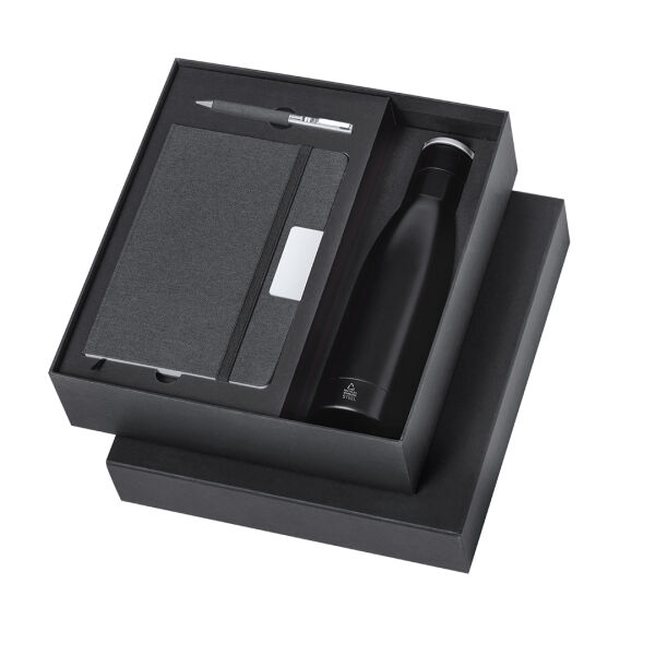 | Omschrijving | <p> De Dexter kantoor cadeauset heeft alles! De set bevat een 500 ml thermosfles van gerecycled roestvrij staal in matzwart met een stevig matzilveren handvat en een roestvrijstalen logo, ideaal om uw drankje onderweg warm of koud te houden. Het bijbehorende notitieboek is gemaakt van RPET, een elegant zwart materiaal van gerecycled plastic, met een metalen plaatje geschikt voor lasergravure, een elastische sluiting, stoffen boekenlegger en 80 enkelgestreepte pagina’s. Het RPET-logo benadrukt het duurzame karakter van het product. De set wordt compleet gemaakt met een RPET-balpen met matzwarte afwerking, draaimechanisme, blauwe inkt, metalen clip en een gepolijste metalen punt. Wow! Alle items zijn netjes verpakt in een individuele doos met matte afwerking en een uitgesneden binnenkant, waardoor elk onderdeel van de set opvalt en uw relatiegeschenk direct indruk maakt. Een prachtig eindejaarsgeschenk.</p> |