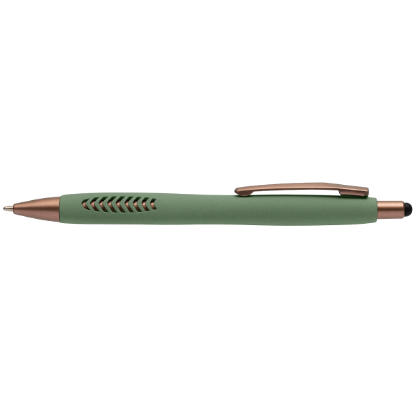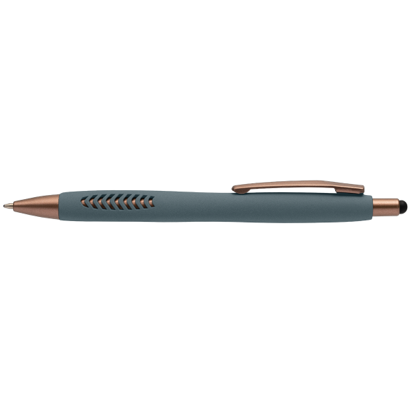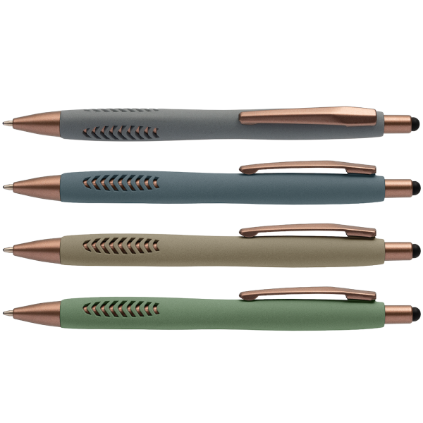 De Gomera balpen is een prachtige stijlvolle en luxe balpen. De soft-touch stone finish zorgt voor een comfortabele grip, terwijl de negen cut-outs de elegante bronzen details zichtbaar maken. Het geheel wordt versterkt door de bronzen accenten op clip, tip en plunjer, wat de pen een moderne uitstraling geeft. De geïntegreerde touch tip maakt de balpen extra praktisch in gebruik. Een pen voor elke gelegenheid.