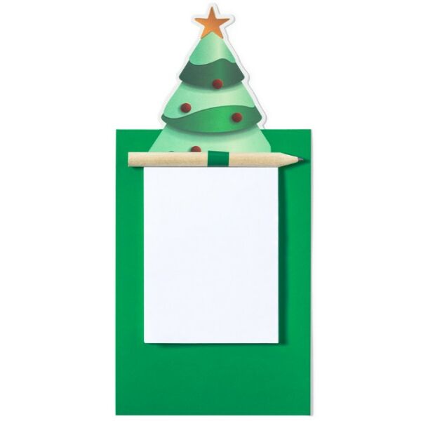 | Omschrijving | <p> Het Lary notitieblok brengt de kerstsfeer direct uw keuken of werkplek in. Het magnetische ontwerp in de vorm van een speelse kerstboom kleeft moeiteloos op koelkasten, kasten of andere metalen oppervlakken, waardoor u altijd een notitie binnen handbereik hebt. Met 40 blanco vellen is dit blok perfect voor boodschappenlijstjes, kleine reminders of snelle krabbels. Het bijgeleverde houten potlood past mooi bij het natuurlijke karakter van het ontwerp en maakt de set helemaal compleet. Een super leuk eindejaarsgeschenk.</p> |