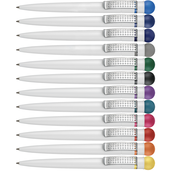 | Omschrijving | Uniek designpen. Balpen met flexibele rubberen drukker. Met stabiele edelstaalclip met gaatjesdesign. Weergegeven prijs is incl. 1 kleur bedrukking op de houder. Breder model. Met groot drukformaat en kwaliteitsvulling Jogger, voor 2000 meter schrijfplezier. |