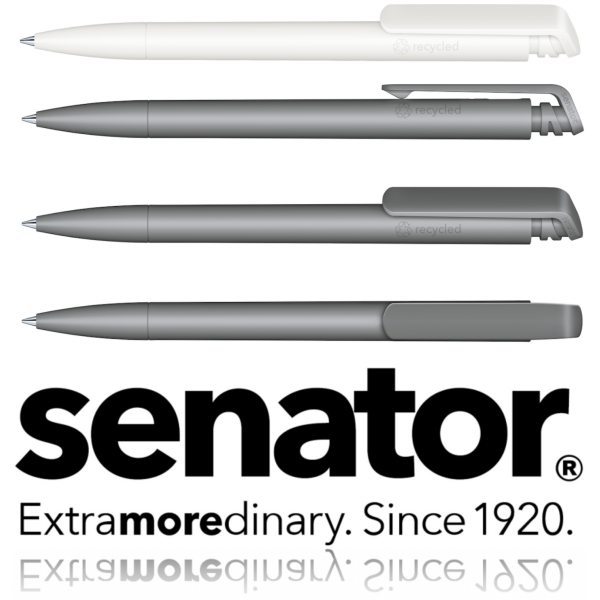 Senator balpennen hebben u als promotiebalpen of bedrijfsbalpen veel te bieden. Met meer dan 95 jaar ervaring in kunststof en metalen schrijfwaren weet Senator hoe goede en aantrekkelijke producten eruit moeten zien. Balpennen van Senator kenmerken zich door opvallende designs, tot in detail verfijnd om zodoende een perfecte promotieartikel te produceren. Balpennen gemaakt van de allerbeste materialen, met diverse ISO-certificaten worden pennen duurzaam en ecologisch gefabriceerd. Award winnaars van uiteenlopende designs. Wat dacht u van de strakke belijning van de Liberty balpen? De sportieve uitstraling van de Dart? Of de tijdloze bestseller de Super hit. Voor elk budget, elk reclameboodschap heeft Senator een passende pen. Extramordinary door de vele kleuren, de vele uitvoeringen en de talloze mogelijkheden. Met een snelle levering van 7 werkdagen, flexibel denken en met de nieuwste high-defination print zit u met Senator balpennen op rozen.