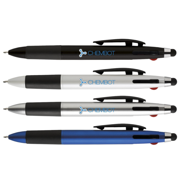 Drie kleuren balpen met zachte rubberen touchtip voor het bedienen van tablets en smartphones. In metallic kleuren. Voorzien van blauwe, rode en zwarte vulling. Verkrijgbaar in 6 kleuren. Weergegeven prijs is incl. bedrukking op de houder.