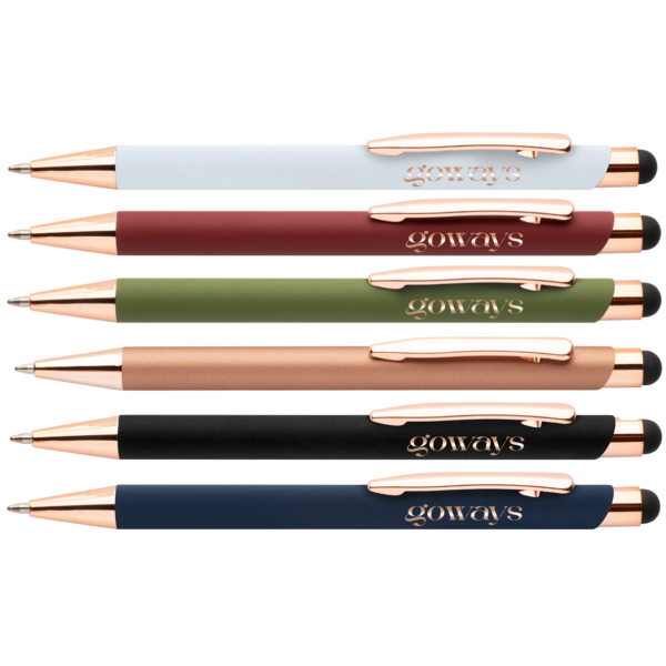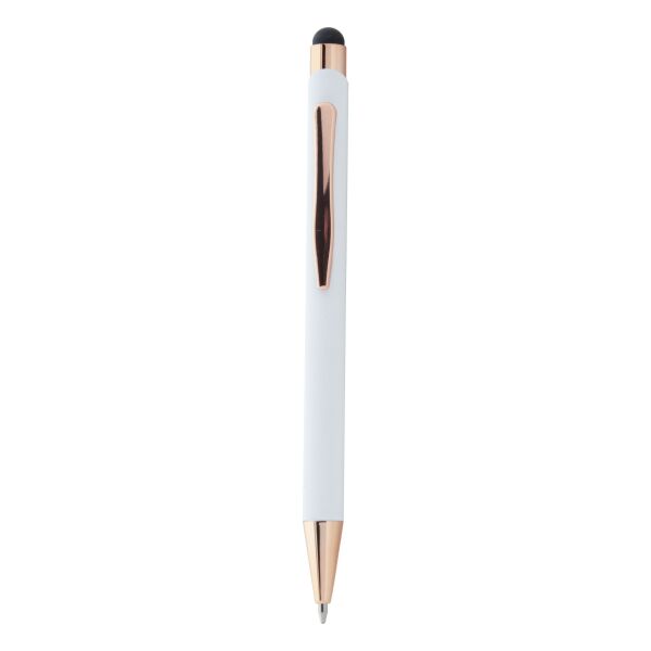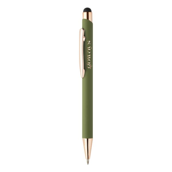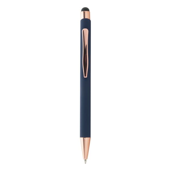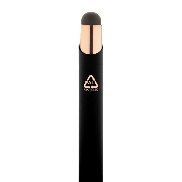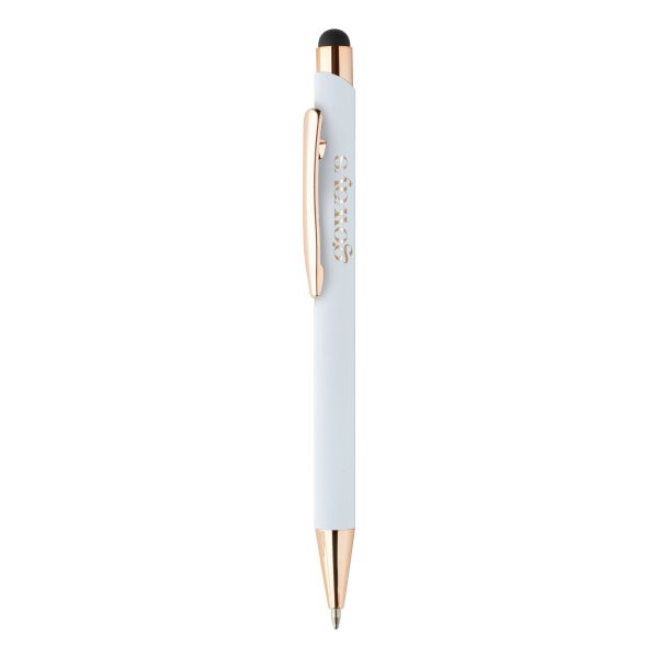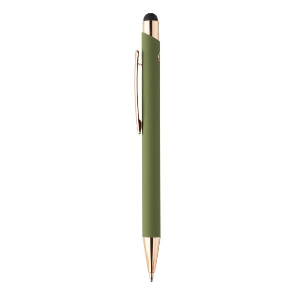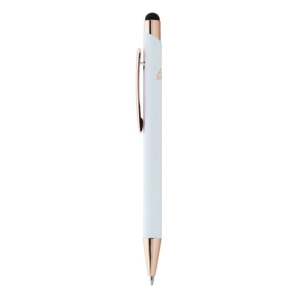 | Omschrijving | <p> Een pen met uitstraling én een goed verhaal. Deze stijlvolle balpen is vervaardigd uit gerecycled aluminium en heeft een zachte rubbercoating die lekker in de hand ligt. De roségouden details zorgen voor een luxueuze touch.<br /> Met de touch tip navigeer je moeiteloos op je tablet of smartphone, terwijl je op papier geniet van een vloeiende blauwe inktlijn. Een moderne multitasker!<br /> Laat je logo of boodschap stralen dankzij de speciale coating voor roségouden spiegelgravure. Zo wordt jouw merk niet alleen gezien, maar ook onthouden.<br /> <br /> ✓ Gerecycled aluminium met rubbercoating<br /> ✓ Touch tip voor touchscreen gebruik<br /> ✓ Luxe roségouden accenten<br /> ✓ Blauwe inkt<br /> ✓ Lasergravure in roségoud mogelijk</p> |