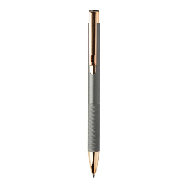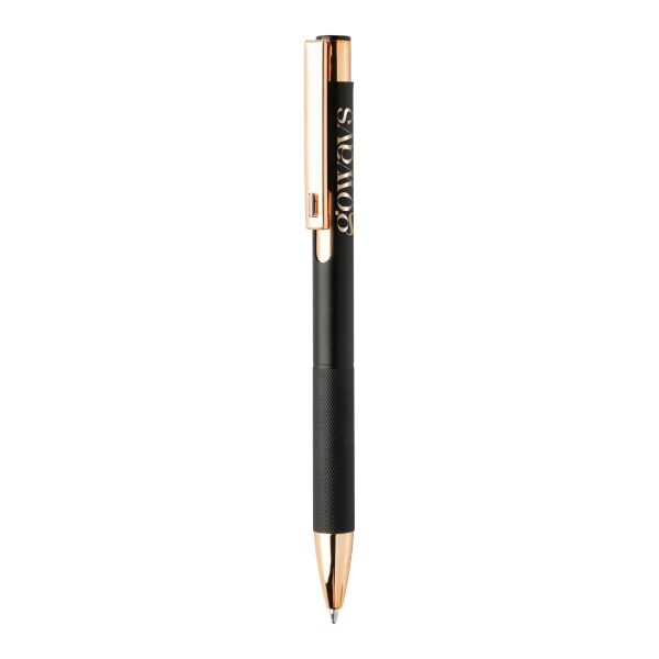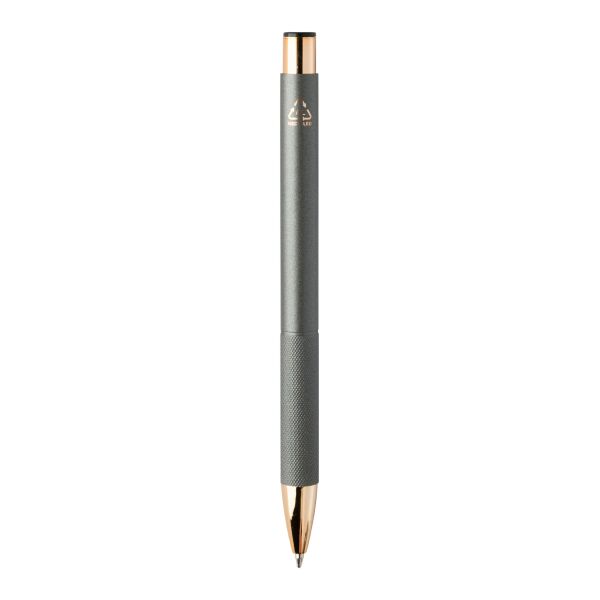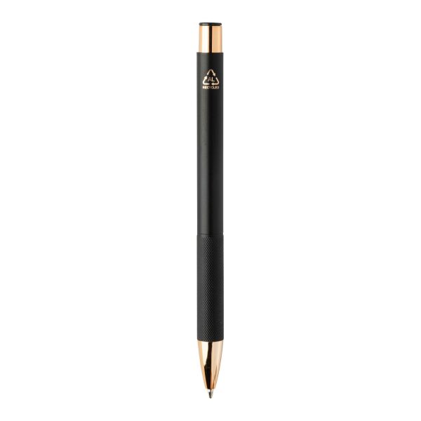 Deze pen laat uw logo stralen en uw glimlach reflecteren! De Wicked Sparkle balpen is een keuze voor iedereen die houdt van elegantie. Het gerecyclede aluminium geeft de pen een stevige basis, terwijl de matte afwerking en het fijne gripgedeelte zorgen voor extra comfort tijdens het schrijven. De gouden details maken het ontwerp compleet en geven de pen een luxueuze uitstraling.